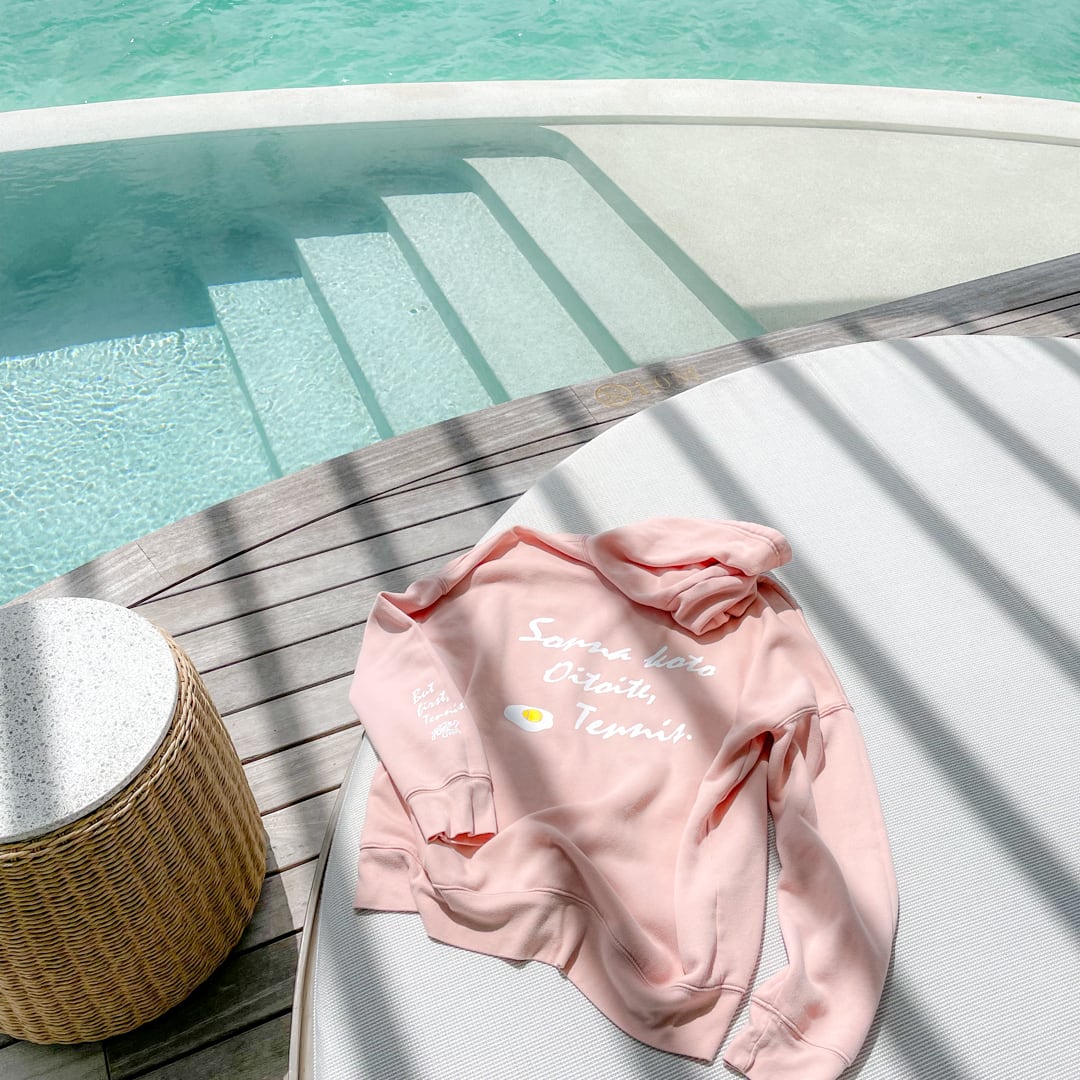 全体のフォルムはかなり幅が広く、肩が外に落ちるスタイル。フードの裏地はフリース起毛、紐はボディーと同色になっています。全体にパーカーとしてはかなり軽い(7.0オンス)デザインで、ふわっとした着心地です。